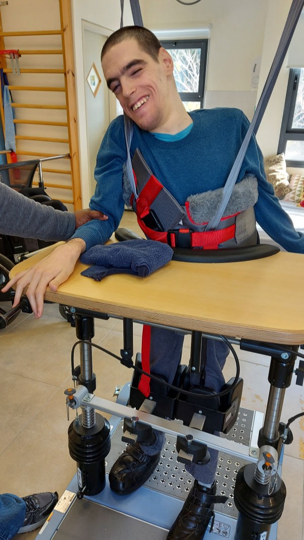 When I first met Tom, he was able to stand up on a TILT bed with a low incline for a maximum of 20 minutes. I started to work with him to increase the time that he stands every week until he stood up for more than 30 minutes at 90 degrees. Then I tried to make him stand up with a standing frame, which was very challenging, at the beginning he was able to keep the position just for 3 minutes, after a few months he got to 20 minutes with supports.