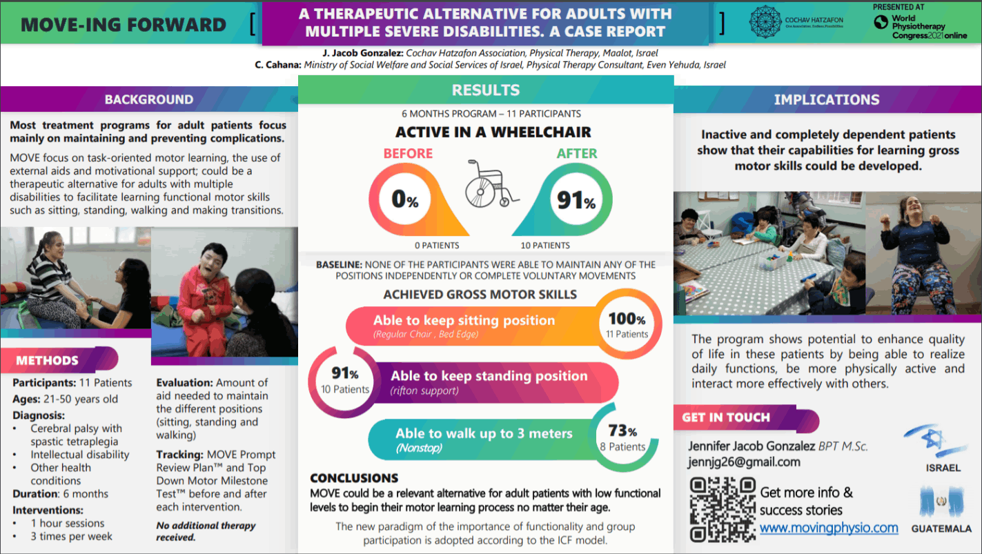 Online presentation regarding the MOVE methodology and the benefits to adults with severe disabilities. Presented to physiotherapists of Israel working under the supervision of the Ministry of Social Welfare & Social Services, Association for the advancement of physiotherapy in Israel